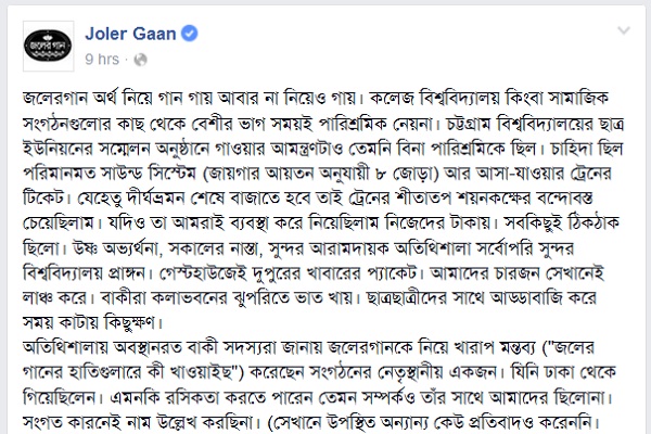 তারা লেখেন, "জলেরগান অর্থ নিয়ে গান গায় আবার না নিয়েও গায়। কলেজ বিশ্ববিদ্যালয় কিংবা সামাজিক সংগঠনগুলোর কাছ থেকে বেশীর ভাগ সময়ই পারিশ্রমিক নেয়না। চট্টগ্রাম বিশ্ববিদ্যালয়ের ছাত্র ইউনিয়নের সম্মেলন অনুষ্ঠানে গাওয়ার আমন্ত্রণটাও তেমনি বিনা পারিশ্রমিকে ছিল।"