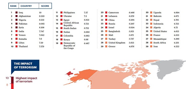 সন্ত্রাসবাদের তালিকায় এক নম্বরে রয়েছে ইরাক। তাদের স্কোর ১০ এ ১০। আর এর পরে রয়েছে আফগানিস্তান, নাইজেরিয়া, পাকিস্তান ও সিরিয়া।