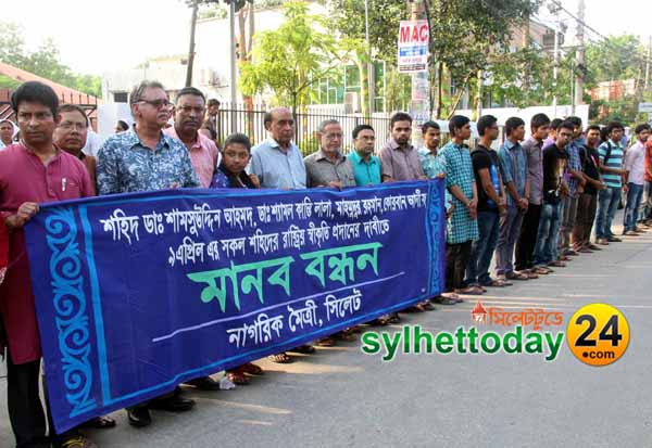 মহান মুক্তিযুদ্ধ চলাকালে একাত্তরের ৯ এপ্রিল বর্বর পাক হানাদার বাহিনীর হাতে নির্মমভাবে শহিদ ডা. শামসুদ্দিন আহমদ ও ডা. শ্যামল কান্তি লালাসহ সিলেটে সরকারি স্থাপনায় পাক হানাদার বাহিনীর প্রথম হামলায় শহিদদের রাষ্ট্রীয় স্বীকৃতির দাবিতে সিলেটে মানববন্ধন কর্মসূচি পালিত হয়েছে।