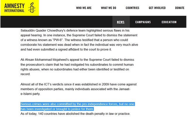 সর্বশেষ বিবৃতিতে (আগেরগুলোর মতোই) মৃত্যুদণ্ডের বিরোধিতার জায়গা থেকে অ্যামনেস্টি ইন্টারন্যাশনাল যুদ্ধাপরাধের বিচারকে ‘রাজনৈতিকভাবে পক্ষপাতমূলক ও উদ্দেশ্যপ্রণোদিত’ বলায় তাদের অবস্থান স্পষ্ট হয়েছে বলে এতে বলা হয়েছে।