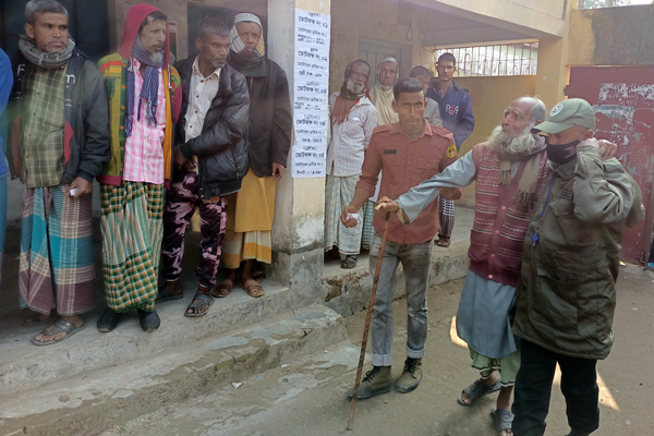 সকাল ন'টায় তাহিরপুর হিফজুল আলীম মাদ্রাসায় ভোট দিতে আসেন ভাটি তাহিরপুর গ্রামের বাসিন্দা জামাল মিয়া(৮৫)।