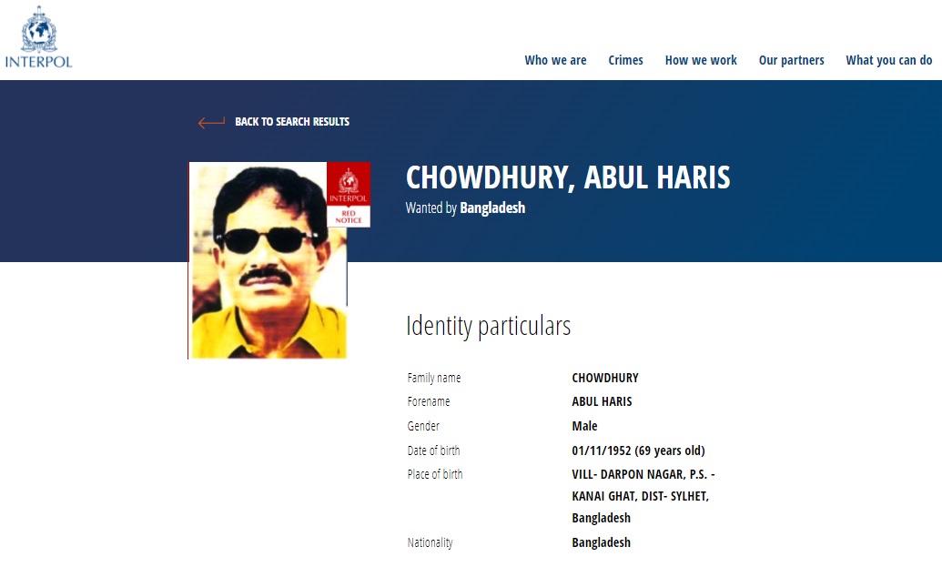 ইন্টারপোলের রেড নোটিসে যুক্ত রয়েছে হারিছ চৌধুরীর নাম। মামলার তদন্ত সংস্থা সিআইডির আবেদনেই রেড নোটিস তোলা হয়েছিল। পুলিশের আন্তর্জাতিক সংস্থা ইন্টারপোলের সঙ্গে যোগাযোগ রক্ষা করে বাংলাদেশ পুলিশ সদর দপ্তরের ন্যাশনাল সেন্ট্রাল ব্যুরো (এনসিবি)।