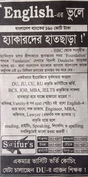বিবিসিকে উদ্ধৃত করে ওই বিজ্ঞাপনে বলা হয়েছে, “হ্যাকিংকৃত ডলার শ্রীলংকাতে স্থানান্তরের সময় `Foundation’ শব্দকে `Fandation’ লেখাতে বিদেশি Deutsche ব্যাংকের সন্দেহ হয়। তারা বাংলাদেশ ব্যাংকেকে জানালে বাংলাদেশ ব্যাংক কর্তৃপক্ষ এই ২০ মিলিয়ন ডলার স্থানান্তর বন্ধ করে দেয়।”