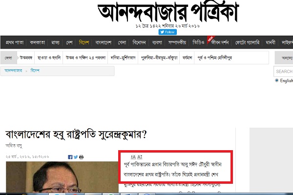 গত ২৫ মার্চ পত্রিকাটির আন্তর্জাতিক পাতায় অমিত বসু নামের এক সাংবাদিক "বাংলাদেশের হবু রাষ্ট্রপতি সুরেন্দ্রকুমার?" শিরোনামে একটি প্রতিবেদন তৈরি করেন। প্রতিবেদনটিতে বাংলাদেশের বর্তমান প্রধান বিচারপতি সুরেন্দ্রকুমার সিনহাকে "হবু" রাষ্ট্রপতি আখ্যা দিয়ে বলা হয় শেখ হাসিনার সরকার তাকে রাষ্ট্রপতি বানাতে চাইছেন। কিন্তু মূলত বর্তমান রাষ্ট্রপতি আব্দুল হামিদের মেয়াদ শেষ হবার এখনো অনেক দিন বাকি। পরবর্তী রাষ্ট্রপতি নিয়ে কোন জল্পনাও নেই বাংলাদেশে।