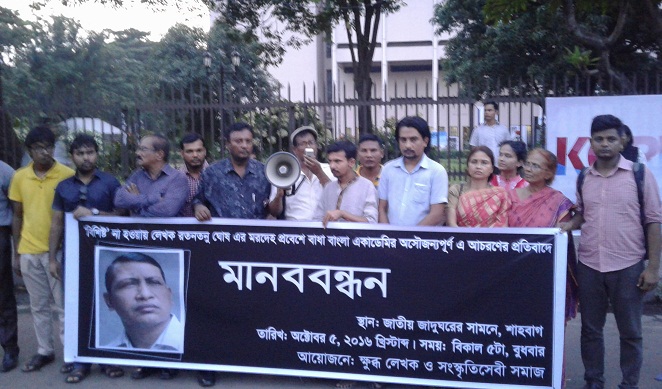 ‘বিশিষ্ট‘ না হওয়ায় অধ্যাপক, প্রাবন্ধিক ও লেখক রতনতনু ঘোষের মরদেহ বাংলা একাডেমিতে প্রবেশে বাধা ও একাডেমীর অসৌজন্যপূর্ণ আচরণের প্রতিবাদে মানববন্ধন করেছে ক্ষুব্ধ লেখক সাহিত্যিকগণ।