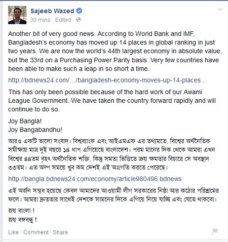 জয় লিখেছেন, "আরও একটি ভালো সংবাদ। বিশ্বব্যাংক এবং আইএমএফ এর তথ্যমতে, বিশ্বের অর্থনৈতিক সমীক্ষায় মাত্র দুই বছরে ১৪ ধাপ এগিয়েছে বাংলাদেশ। পরম মানের দিক থেকে আমরা এখন বিশ্বের ৪৪তম বৃহৎ অর্থনৈতিক শক্তি, কিন্তু সমতা ভিত্তিতে ক্রয় ক্ষমতার বিচারে সে অবস্থান ৩৩তম। এত অল্প সময়ে খুব কম দেশই এই অগ্রগতি করতে পেরেছে। "