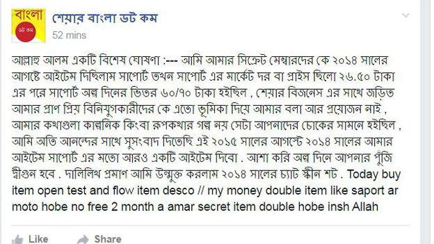 'বাংলাদেশ স্টক মার্কেট শেয়ার বিজনেস' নামে আরেকটি পাতায় দেখা যাচ্ছে এই পাতার ব্যবহারকারীরা ক্রেতাদের বিভিন্ন কোম্পানির শেয়ার কিনতে পরামর্শ দিচ্ছেন এবং যারা পরামর্শ শোনেননি তারা কিভাবে ক্ষতিগ্রস্ত হচ্ছেন তার ব্যাখ্যা তুলে ধরা হচ্ছে।