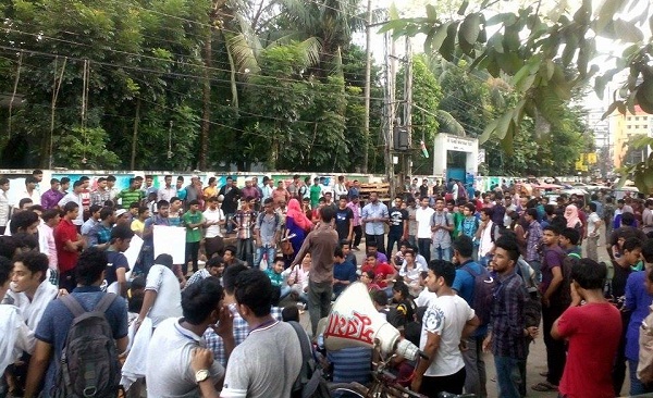ধানমন্ডি ১৫ নম্বর সড়কে স্ট্যামফোর্ড বিশ্ববিদ্যালয়ের শিক্ষার্থীরা নিজেদের ক্যাম্পাসের সামনে অবস্থান নিয়ে আছে।