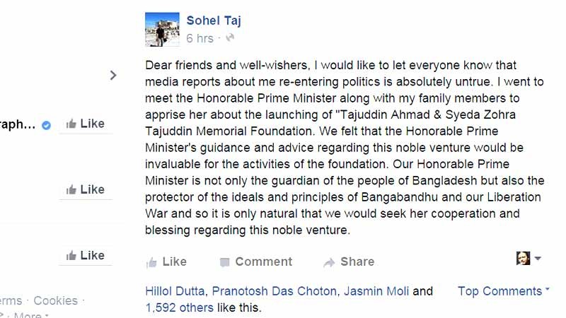 ওই সাক্ষাতের কয়েকটি ছবি ওই দিন রাতেই সামাজিক যোগাযোগ মাধ্যমে ছড়িয়ে পড়ে। এর পর খবর ছড়ায় রাজনীতিতে ফিরছেন সোহেল তাজ। কিন্তু আজ (সোমবার) তিনি ফেসবুক স্ট্যাটাসে রাজনীতিতে ফেরার সম্ভাবনা উড়িয়ে দিলেন।