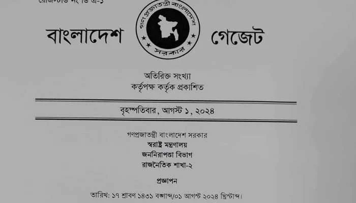 বৃহস্পতিবার (১ আগস্ট) স্বরাষ্ট্র মন্ত্রণালয় থেকে এ সংক্রান্ত প্রজ্ঞাপন জারি করা হয়েছে।