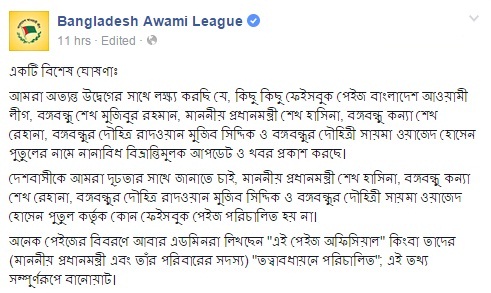 ওই পেজগুলো শেখ হাসিনা, শেখ রেহানা, পুতুল এবং ববি পরিচালনা করেন না বলেও ঘোষণায় জাননো হয়।
