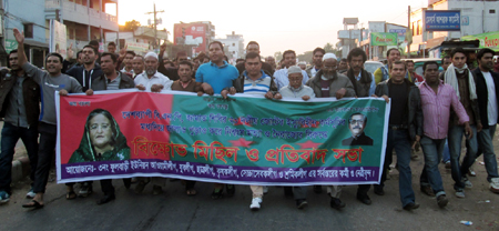 জামায়াত-বিএনপির নৈরাজ্যের প্রতিবাদে সিলেটের গোলাপগঞ্জ উপজেলার ফুলবাড়ি ইউনিয়ন আওয়ামী লীগের উদ্যোগে সোমবার হেতিমগঞ্জ বাজারে এক বিক্ষোভ মিছিল অনুষ্ঠিত হয়েছে।