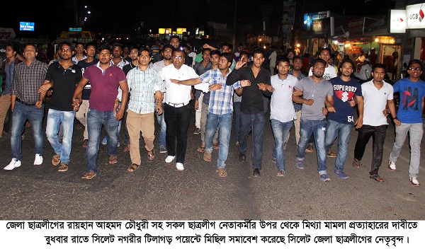 সমাবেশে বক্তারা বলেন, সিলেট জেলা ছাত্রলীগের উজ্জ্বল নক্ষত্র ছাত্রদের প্রাণপ্রিয় নেতা জেলা ছাত্রলীগের সাধারণ সম্পাদক রায়হান আহমদ, এম. সি. কলেজের সংঘর্ষের ঘটনায় জড়িত ছিলেন না, কিন্তু যুক্তরাজ্যের আওয়ামীলীগের এক নেতা প্রভাব খাটিয়ে তাকে সহ ছাত্রলীগের নিরপরাধ নেতাকর্মীদের উপর মিথ্যা মামলা দায়ের করেছে। আমরা অবিলম্বে এই মিথ্যা মামলা প্রত্যাহার করার দাবী জানাচ্ছি। অন্যথায় সিলেট জেলা ছাত্রলীগ কঠোর কর্মসূচি দিতে বাধ্য হবে।