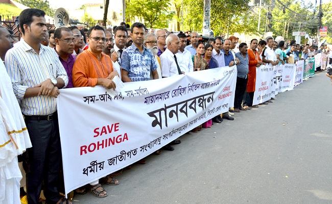 সোমবার (১৮ সেপ্টেম্বর) বিকেলে সিলেট কেন্দ্রীয় শহীদমিনারের সম্মুখে অনুষ্ঠিত মানববন্ধন কর্মসূচীতে বিভিন্ন ধর্মীয় সংখ্যালঘু সংগঠন, মন্দির ও সামাজিক প্রতিষ্ঠা সমূহ নিজ নিজ ব্যানার নিয়ে মানববন্ধনে অংশ নেয়। সমন্বয় সংগঠনের সিলেট মহানগর আহ্বায়ক এডভোকেট মৃত্যুঞ্জয় ধর ভোলার সভাপতিত্বে ও সদস্য সচিব প্রদীপ কুমার দেব এর পরিচালনায় মানববন্ধন চলাকালীন প্রতিবাদে সংহতি জানিয়ে বক্তারা বলেন, মায়ানমারের যে অমানবিক হত্যা, নির্যাতন ও ধ্বংসযজ্ঞ রোহিঙ্গাদের উপর চালানো হচ্ছে তা বিশ্বের কোন বিবেকবান মানুষ সহ্য করতে পারবে না। তারা বলেন, মায়ানমারের নোবেল বিজয়ী অংসান সুচি ও সামরিক বাহিনী যেভাবে রোহিঙ্গা জনগোষ্ঠীকে অন্ধকারের দিকে ঠেলে দিয়েছে তা বিশ্ব নেতৃত্বকে ঐক্যবদ্ধভাবে এর জবাব দেয়া প্রয়োজন।
