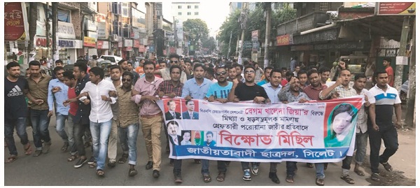 বিএনপি চেয়ারপার্সন দেশনেত্রী বেগম খালেদা জিয়ার বিরুদ্ধে গ্রেপ্তারি পরোয়ানা জারির প্রতিবাদে কেন্দ্রীয় কর্মসূচীর অংশ হিসেবে জাতীয়তাবাদী ছাত্রদলের উদ্যোগে মঙ্গলবার বিকেলে সিলেট নগরীতে বিক্ষোভ মিছিল ও সমাবেশ অনুষ্ঠিত হয়। মিছিলটি সিলেট কেন্দ্রীয় শহীদ মিনার থেকে শুরু করে চৌহাট্টা হয়ে দরগাহ গেইট পয়েন্টে গিয়ে সমাবেশ অনুষ্ঠিত হয়।