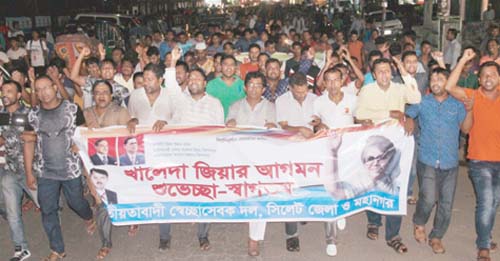 চিকিৎসা শেষে গ্রেফতারী পরোয়ানা উপেক্ষা করে বিএনপি চেয়ারপার্সন সাবেক প্রধান মন্ত্রী বেগম খালেদা জিয়ার স্বদেশ প্রত্যাবর্তনকে স্বাগত জানিয়ে বুধবার সন্ধ্যায় নগরীতে আনন্দ মিছিল ও সমাবেশ করে সিলেট জেলা ও মহানগর স্বেচ্ছাসেবকদল।