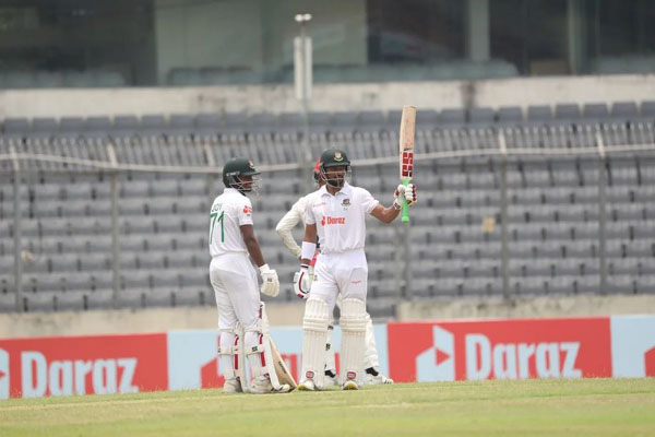 শান্তর সেঞ্চুরিতে বাংলাদেশও আছে শক্ত অবস্থায়। আফগানিস্তানের বিপক্ষে টস হেরে ব্যাট করতে নেমে চা-বিরতির পর্যন্ত স্বাগতিকদের সংগ্রহ ২ উইকেটে ২৩৫ রান। শান্তর সঙ্গে দ্বিতীয় উইকেটে ২৬৭ বলে ২১২ রানের জুটির পর ফিরে গেছেন মাহমুদুল হাসান জয়। ১৩২ বলে ৭১ করা জয় অনিয়মিত লেগ স্পিনার রহমাত শাহর বলে স্লিপে ক্যাচ দিয়ে থামেন। প্রথম সেশনে ২৪ ওভারে ১ উইকেটে ১১৬ রানের পর দ্বিতীয় সেশনে ২৫ ওভারে ১১৯ রান যোগ করেছে লিটন দাসের দল।