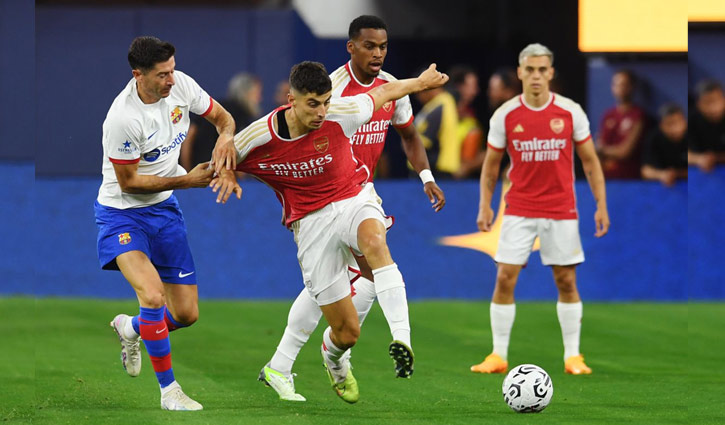 বৃহস্পতিবার সকালে ক্যালিফোর্নিয়ার সোফি স্টেডিয়ামের ম্যাচের ৭ মিনিটেই রবার্ত লেভানডোফস্কির গোলে এগিয়ে যায় বার্সেলোনা। তবে তাদের বেশিক্ষণ এগিয়ে থাকতে দেয়নি গার্নার্সরা। ১৩ মিনিটের মাথায় বুকায়ো সাকার গোলে সমতা ফেরায় আর্সেনাল।