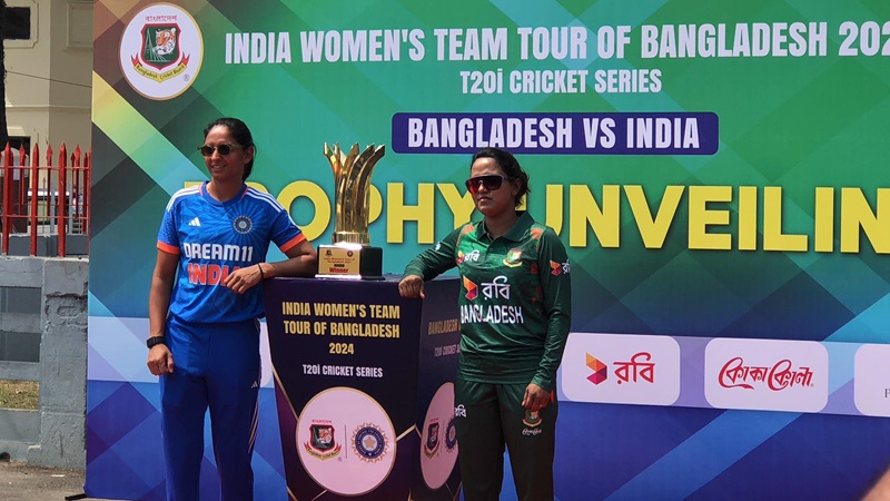 সিলেটের সুরমা নদীর তীরে (কিন ব্রিজের পাশে) ঐতিহাসিক আলী আমজাদের ঘড়ির সামনে পাঁচ ম্যাচের টি-টোয়েন্টি সিরিজের ট্রফি উন্মোচন করেছেন বাংলাদেশের অধিনায়ক নিগার সুলতানা জ্যোতি এবং ভারত দলনেতা হারমানপ্রীত।