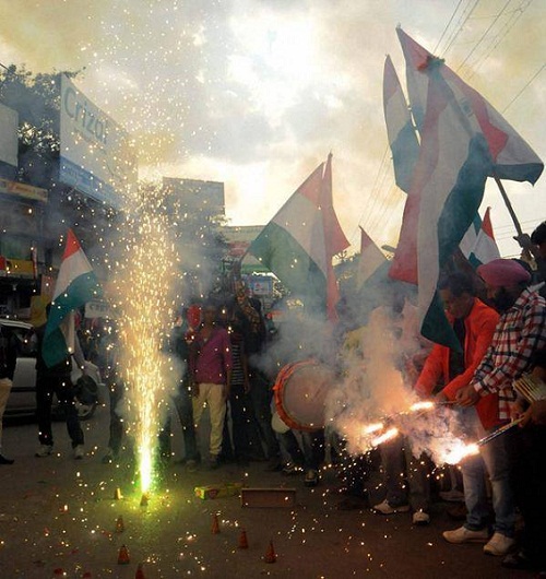 বিশ্বকাপে আবারও পাকিস্তানকে হারানোয় উৎসবে মেতেছে ভারতীয়রা । দিল্লি, কলকাতা, মুম্বাই, ব্যাঙ্গালুরু সবগুলো বড় শহরে সমর্থকরা রঙ ছিটিয়ে , আতশবাজি ফুটিয়ে বিজয়ল্লাস করেছেন এদিকে ভারতীয় দলকে জয়ের অভিনন্দন জানিয়েছেন দেশটির প্রধানমন্ত্রী নরেন্দ্র মোদীর।বার্তায় বললেন, অভিনন্দন টিম ইন্ডিয়া। দারুণ খেলেছ। তোমাদের জন্য গর্বিত গোটা দেশ।পাকিস্তানের বিরুদ্ধে ৭৬ রানে ধোনিবাহিনীর জয়ের পরই টুইটারে অভিনন্দন বার্তা পাঠান তিনি।