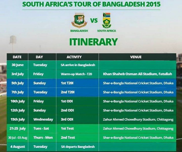সফর শুরু হবে একটি প্রস্তুতিমূলক টি-টোয়েন্টি ম্যাচ দিয়ে। আগস্টের ৪ তারিখ বাংলাদেশ সফর শেষ করে দেশে ফিরবে দক্ষিণ আফ্রিকা।