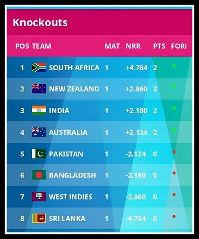আইসিসি'র ওয়েবসাইট থেকে বিশ্বকাপের দলীয় অবস্থান থেকে দেখা যায় ৪ সেমিফাইনালিষ্টই স্বাভাবিক কারনে থাকছে প্রথম চারটি অবস্থানে। এরপর ৫ম স্থানে আছে পাকিস্তান। ৬ষ্ট স্থানে বাংলাদেশ, ৭ম আছে ওয়েষ্ট ইন্ডিজ এবং ৮ম স্থানে রয়েছে শ্রীলঙ্কা।