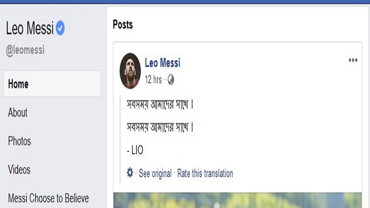 বাংলাদেশের প্রায় প্রতিটি উৎসবেই শুভেচ্ছাবার্তা পাঠায় লা লিগা বা বার্সেলোনা। কখনও সেটি বাংলায়, আবার কখনও ইংরেজিতে। এবার বাংলাদেশের ভক্তদের চমকে দিলেন বার্সা প্রাণভোমরা লিওনেল মেসি। বাংলায় স্ট্যাটাস দিয়েছেন তিনি। তাতে বেজে উঠেছে বিষাদের সুর।