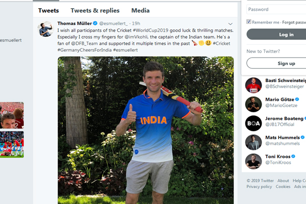 ৫ জুন শুরু হচ্ছে ভারতের বিশ্বকাপ মিশন। দক্ষিণ আফ্রিকার সাথে ম্যাচের আগেই অধিনায়ক বিরাট কোহলির সুবাদে জার্মানি এবং বায়ার্ন মিউনিখের তারকা ফুটবলার টমাস মুলারের শুভকামনা পেয়েছে ভারত।