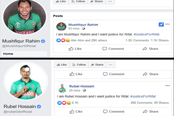 জাতীয় দলের উইকেটরক্ষক ব্যাটসম্যান মুশফিক তার ফেসবুক পেজে লিখেন, ‘আমি মুশফিকুর রহীম এবং আমি রিফাত হত্যার ন্যায়বিচার চাই। #জাস্টিসফররিফাত।’ একই ভাবে তারকা পেসার রুবেল হোসেন লিখেন, ‘আমি রুবেল হোসেন এবং আমি রিফাত হত্যার ন্যায়বিচার চাই। #জাস্টিসফররিফাত।’