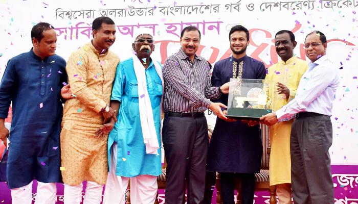মঙ্গলবার চট্টগ্রাম জেলা ক্রীড়া সংস্থার পক্ষ থেকে বিশ্বসেরা অলরাউন্ডারকে সংবর্ধনা দেওয়া হয়। বিকাল ৫টায় তার হাতে নগর চাবি তুলে দেন চট্টগ্রাম সিটি করপোরেশনের মেয়র আ জ ম নাছির উদ্দিন। তিনি বলেন, ‘সাকিব আল হাসান বিশ্বকাপ ক্রিকেটে ভালো করে বাংলাদেশের নাম উজ্জ্বল করেছেন। তার মতো একজন ক্রিকেটারকে সংবর্ধিত করতে পেরে আমরা আনন্দবোধ করছি।’