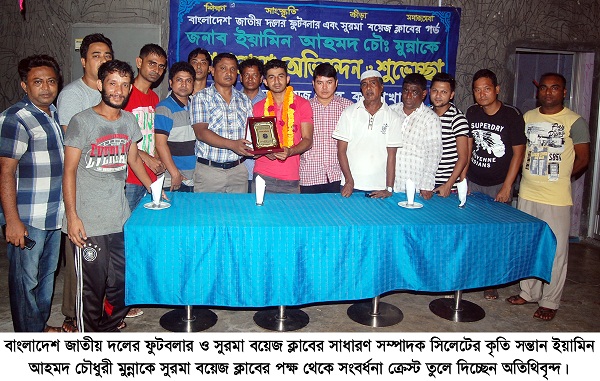 বাংলাদেশ জাতীয় দলের ফুটবলার ও সুরমা বয়েজ ক্লাবের সাধারণ সম্পাদক সিলেটের কৃতি সন্তান ইয়ামিন আহমদ চৌধুরী মুন্নাকে সংবর্ধনা প্রদান করে সুরমা বয়েজ ক্লাব।