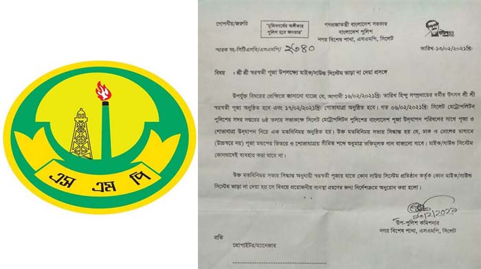 সিলেট মহানগর পুলিশের নগর বিশেষ শাখার উপ কমিশনার সাক্ষরিত এই চিঠিতে উল্লেখ করা হয়- ১৬ ফেব্রুয়ারি হিন্দু সম্প্রদায়ের ধর্মীয় উৎসব শ্রীশ্রী সরস্বতী পূজা অনুষ্ঠিত হবে এবং ১৭ ফেব্রুয়ারি শোভাযাত্রা অনুষ্ঠিত হবে। গত ৬ ফেব্রুয়ারি সিলেট মেট্রোপলিটন পুলিশ সদর দপ্তরের ৬ষ্ট তলায় বাংলাদেশ পূজা উদযাপন পরিষদের সাথে পূজা ও শোভাযাত্রা নিয়ে মতবিনিময় সভা অনুষ্ঠিত হয়। উক্ত মতবিনিময় সভায় সিদ্ধান্ত হয় যে, ঢাক ও ঢোলের মাধ্যমে (উচ্চস্বরে নয়) পূজা মন্ডপের ভেতরে ও শোভাযাত্রা সীমিত শব্দে শুধুমাত্র ভক্তিমূলক গান বাজানো হবে। মাইক/সাইন্ড সিস্টেম কোনোভাবেই ব্যবহার করা যাবে না।