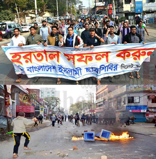 প্রত্যাক্ষদর্শীরা জানান, হরতালের শুরুতেই রোববার সকাল সাড়ে ৭টায় সিলেট নগরীর দরগাহ গেইট থেকে শিবির নেতাকর্মীরা একটি মিছিল বের করে। মিছিলটি চৌহাট্টা সিভিল সার্জন অফিসের সামনে এসে শেষ হয়। এ সময় শিবির নেতাকর্মীরা রাস্তায় আগুন দিয়ে সড়ক অবরোধ করে সংক্ষিপ্ত সমাবেশে করে।