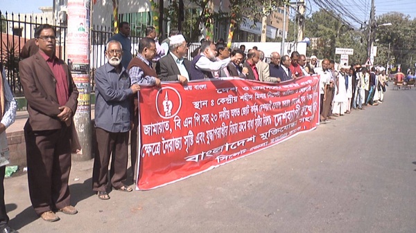 বক্তারা; দেশব্যাপী বিশ দলীয় জোটোর নাশকতা ও মানুষ হত্যাকে মানবতাবিরোধী কর্মকান্ড উল্লেখ করে এসব অপতৎপরতার বিরুদ্ধে রুখে দাঁড়াতে সাধারন মানুষদের প্রতি আহ্বান জানান। মানববন্ধন শেষে একটি বিক্ষোভ মিছিল নগরীরর বিভিন্ন সড়ক প্রদক্ষিন করে।