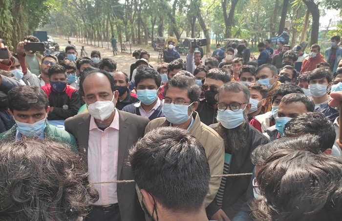 মঙ্গলবার (২৫ জানুয়ারি) দুপুরে ভিসির বাস ভবনের সামনে থেকে গার্ডরা শিক্ষকদের খাবার ভিসির কাছে নিয়ে যাওয়ার জন্য আসেন। পরে তাদেরকে ভেতরে যেতে দেওয়া হয়নি।