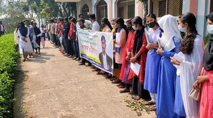 বুধবার দুপুরে কলেজ প্রাঙ্গণে ঘন্টাব্যাপী মানববন্ধন কর্মসূচি পালন করে শিক্ষার্থী ও কর্মচারীরা।