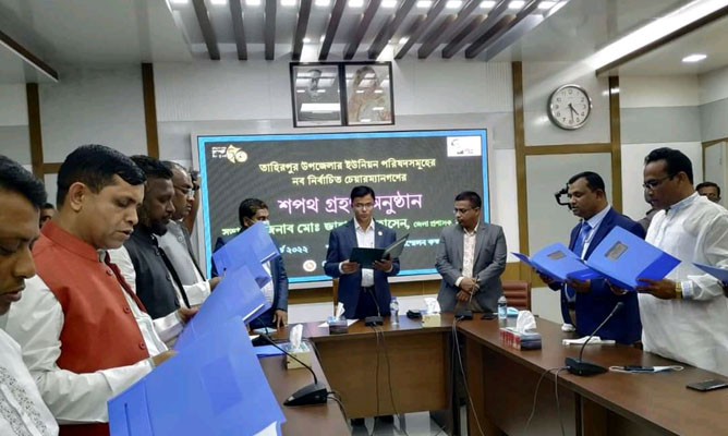 শপথ গ্রহণকারী চেয়ারম্যানগণ হলেন- তাহিরপুর সদর ইউনিয়ন পরিষদে জুনাব আলী, বাদাঘাট ইউনিয়ন পরিষদে নিজাম উদ্দিন, বালিজুরী ইউনিয়ন পরিষদে মো. আজাদ হোসাইন, উত্তর বড়দল ইউনিয়ন পরিষদে মাসুক মিয়া, উত্তর শ্রীপুর ইউনিয়ন পরিষদে আলী হায়দার, দক্ষিণ শ্রীপুর ইউনিয়ন পরিষদে আলী আহমদ মোরাদ, দক্ষিণ বড়দল ইউনিয়ন পরিষদে ইউনুস আলী।