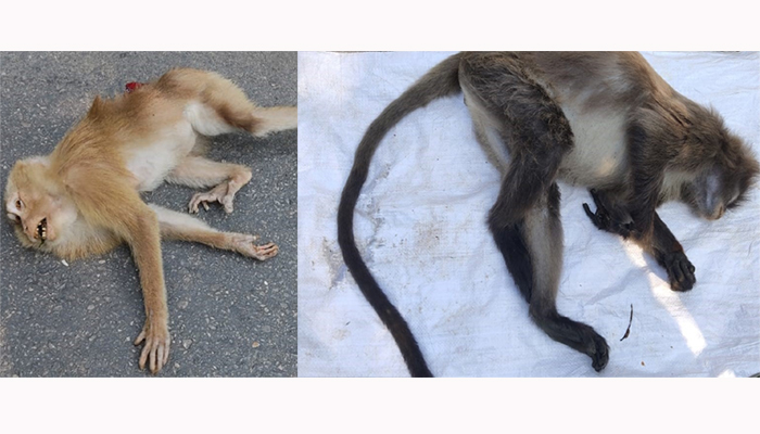 বন্যপ্রাণি ব্যবস্থাপনা ও প্রকৃতি সংরক্ষণ বিভাগ সূত্রে জানা যায়, বৃহস্পতিবার বিকেল ৪টার দিকে লাউয়াছড়া জাতীয় উদ্যানের বন্যপ্রাণি রেসকিউ সেন্টারের চলমান ৩৩ হাজার কেভি বিদ্যুৎ লাইনে বিদ্যুতায়িত হয়ে একটি মুখপোড়া হনুমান মরে রাস্তায় পড়ে থাকে। একই সময়ে ৯ মাসের সন্তানসহ রাস্তা পারাপারকালে দ্রুতগতির মোটরসাইকেলের ধাক্কায় একটি উল্টো লেজি বানর মারা যায়।