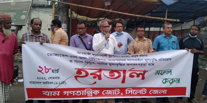 এ সময় নেতৃবৃন্দ বলেন, ‘সারাদেশে লাগামহীন দ্রব্যমূল্য বৃদ্ধির কারণে জনজীবন দুর্বিষহ হয়ে উঠেছে। মানুষ এখন কম খেয়েও সংসার চালাতে পারছে না। করোনার কারণে একদিকে দেশে লক্ষাধিক মানুষ কাজ হারিয়েছে। অন্যদিকে ব্যবসায়ী সিন্ডিকেটের কারণে নিত্যপণ্যের দাম আকাশ ছোঁয়া। কিন্তু সরকার আজ জনগণের দিকে না তাকিয়ে ব্যবসায়ীদের স্বার্থ দেখছে। এ অবস্থায় মানুষের জীবন বাঁচাতে আগামী ২৮ মার্চের হরতাল সফল করতে হবে।’ সভা শেষে নগরের দক্ষিণ সুরমার বিভিন্ন এলাকায় লিফলেট বিতরণ করেন নেতৃবৃন্দ।