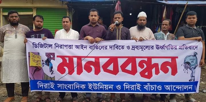 সুনামগঞ্জের দিরাইয়ে ডিজিটাল নিরাপত্তা আইন বাতিলের দাবি ও দ্রব্যমূল্যের উর্ধ্বগতির প্রতিবাদে মানববন্ধন হয়েছে। শুক্রবার বেলা ২ টায় দিরাই পৌর শহরের থানা পয়েন্টে দিরাই সাংবাদিক ইউনিয়ন ও দিরাই বাঁচাও আন্দোলনের আয়োজনে এ মানববন্ধন হয়।