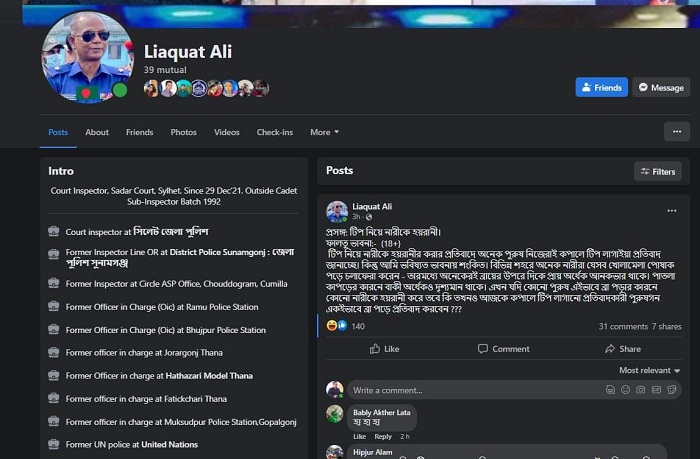 টিপ পরায় এক নারীকে হেনস্তায় তোলপাড় চলছে দেশজুড়ে। পুলিশ সদস্যের এমন ঔদ্ধত্যের প্রতিবাদে সামিল হয়েছেন বিভিন্ন শ্রেণিপেশার মানুষ। তবে এই প্রতিবাদকারীদের নিয়েই ব্যঙ্গ করেছেন আরেক পুলিশ সদস্য। লিয়াকত আলী নামের ওই পুলিশ কর্মকর্তা সিলেট জেলা পুলিশের আদালত পরিদর্শক হিসেবে কর্মরত।