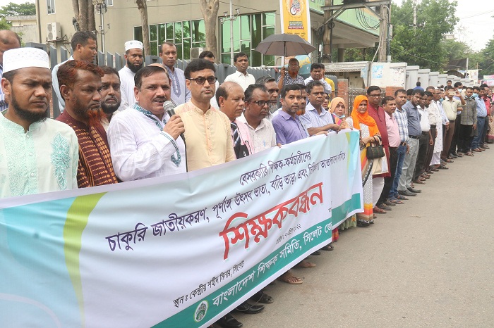 বেসরকারি শিক্ষক-কর্মচারীদের চাকুরী জাতীয়করণ, পূর্ণাঙ্গ উৎসব ভাতা, বাড়ি ভাড়া ও চিকিৎসা ভাতা প্রদানের দাবিতে বাংলাদেশ শিক্ষক সমিতি (বাশিস) সিলেট জেলা শাখার উদ্যোগে বৃহস্পতিবার (৭ এপ্রিল) দুপুর ১২টায় নগরীর কেন্দ্রীয় শহীদ মিনার প্রাঙ্গনে শিক্ষকবন্ধন করা হয়েছে।