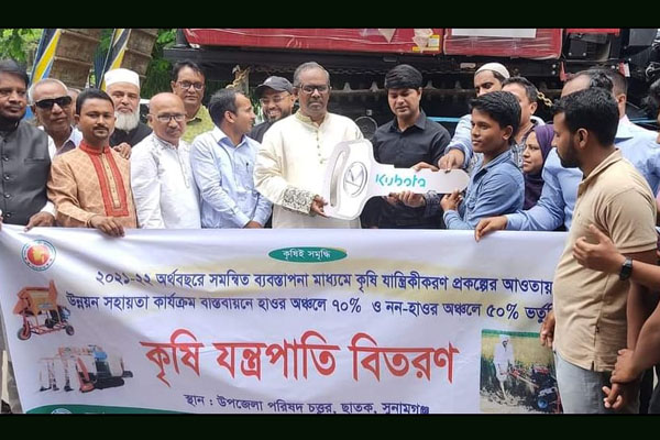 সুনামগঞ্জের ছাতকে ধান কাটার মেশিন কম্বাইন হারভেষ্টার কৃষকদের মাঝে বিতরণ করা হয়েছে। সোমবার (১১এপ্রিল) দুপুরে উপজেলা পরিষদ চত্বরে ৪টি কম্বাইন হারভেষ্টার মেশিন আনুষ্ঠানিকভাবে কৃষকদের হাতে তুলে দেন সুনামগঞ্জ-৫ আসনের সংসদ সদস্য মুহিবুর রহমান মানিক।