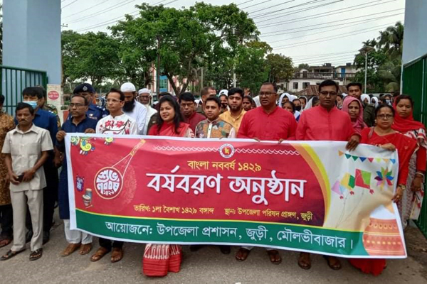 মৌলভীবাজার জেলার জুড়ী উপজেলায় বর্ণিল আয়োজনে বাংলা শুভ নববর্ষ ১৪২৯ পালিত হয়েছে। বৃহস্পতিবার (১৪ এপ্রিল) সকাল ১১ টায় উপজেলা প্রশাসন এর আয়োজনে নানান সাজে সজ্জিত হয়ে উপজেলা নির্বাহী কর্মকর্তা সোনিয়া সুলতানার নেতৃত্বে উপজেলা প্রাঙ্গণ থেকে এক মঙ্গল শোভাযাত্রা বের করা হয়। মঙ্গল শোভাযাত্রাটি শহরের প্রধান সড়ক প্রদক্ষিণ শেষে উপজেলা প্রাঙ্গণে এসে শেষ হয়।