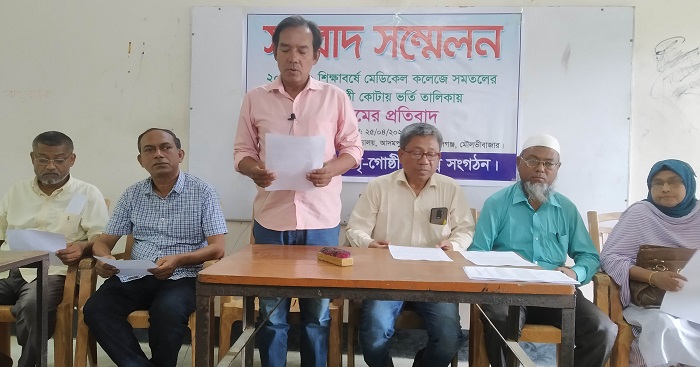 সংবাদ সম্মেলনে বাংলাদেশ মণিপুরী সমাজ কল্যাণ সমিতির সাধারণ সম্পাদক কমলা বাবু সিংহ লিখিত বক্তব্যে বলেন, বাংলাদেশে সমতলে বসবাসরত উপজাতি/ক্ষুদ্র নৃগোষ্ঠিভূক্ত শিক্ষার্থীদের জন্য সরকারি মেডিকেল কলেজে এমবিবিএস কোর্সে ভর্তির জন্য ৮টি কোটা বরাদ্দ রাখা হয়েছে। ২০২১-২২ শিক্ষাবর্ষে সরকারি মেডিকেল কলেজে ৭৭ নম্বর কোডে প্রকাশিত তালিকায় বহিরাগত প্রার্থীর নাম অন্তর্ভূক্তি রয়েছে। বিগত কয়েক বছর যাবত এভাবে বহিরাগত প্রার্থীর নাম অন্তর্ভূক্ত থাকে। ২০২০-২১ শিক্ষাবর্ষে এ ধরণের অনিয়মের কারণে স্বাস্থ্য অধিদপ্তরে লিখিত অভিযোগ প্রেরণ ও হাইকোর্টে রিট আবেদন করলে হাইকোর্ট রুলনিশি জারি করেন। এতকিছুর পরও একই ঘটনার পুণরাবৃত্তি ঘটছে। ফলে ক্ষুদ্র নৃগোষ্ঠির শিক্ষার্থী এবং অভিভাবকরা হতাশাগ্রস্ত। বাংলাদেশ সরকারের একটি মহৎ উদ্দেশ্য বাস্তবায়নে স্বাস্থ্য অধিদপ্তরের ভুলের কারণে বারবার বাঁধাগ্রস্ত হচ্ছে। গত কয়েক বছর যাবত স্বাস্থ্য অধিদপ্তর এ ধরনের ভুল করার কারণে অনেক উপজাতি শিক্ষার্থী মেডিকেল কলেজে ভর্তি হতে বঞ্চিত।