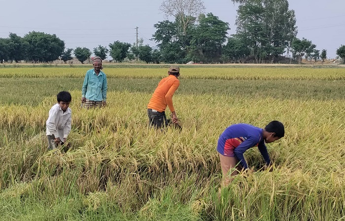 নিলুফা বলে, ‘বাবা মাঠে ধান কাটছে। আর আমরা এখানে মায়ের সঙ্গে ধান শুকানো ও বাছাইয়ের কাজ করছি।’