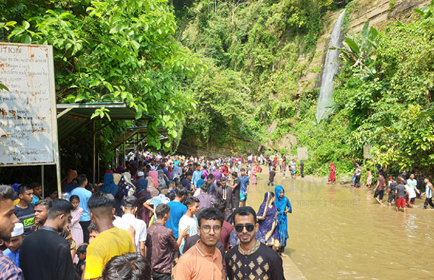 বুধবার বিকেলে সরেজমিনে মাধবকুন্ড ইকোপার্কে প্রবেশের আগে সড়কে প্রায় এক কিলোমিটার যানজটের দীর্ঘ লাইন দেখা গেছে। সেখানে যানজট নিরসনে কাজ করছিলেন ট্যুরিস্ট পুলিশের সদস্যরা। মাধবকুন্ড ইকোপার্ক এলাকায় পৌঁছার পর বিভিন্ন বয়সী মানুষের উপচেপড়া ভিড় দেখা গেছে। বিভিন্ন পণ্যের দোকান, খাবার হোটেলগুলোতেও ভিড় ছিল বেশি। জলপ্রপাত এলাকায় প্রবেশের পর দেখা গেছে মানুষের আনন্দ-উচ্ছ্বাস। দল বেধে মাধবকুন্ডের জলে নেমে হইহুল্লোড় আর আনন্দ-উল্লাসে মেতেছিল নানা বয়সী মানুষ। কেউ কেউ ঝরনার জলে সাঁতার কাটছিলেন। আবার অনেকে পাড়ে দাঁড়িয়ে প্রায় ২০০ ফুট ওপর থেকে অবিরাম ঝরনার জলপতনের দৃশ্য ও আশপাশের সবুজ প্রকৃতি উপভোগ করছিলেন। স্মৃতি হিসেবে ধরতে রাখতে এসব দৃশ্য তারা ক্যামেরা বন্দি করছিলেন।