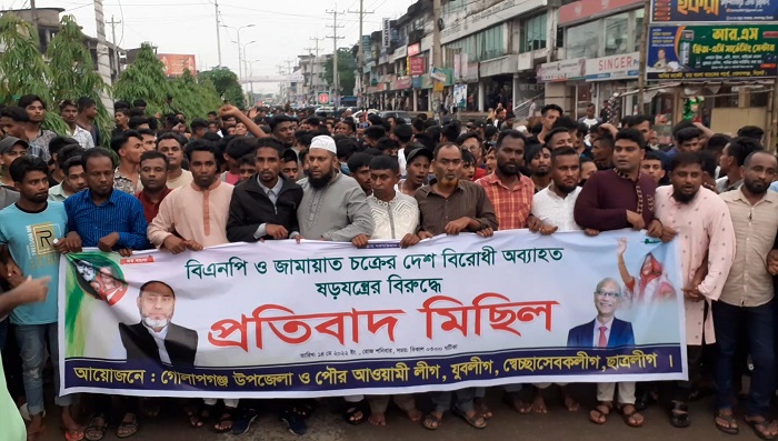 সিলেটের গোলাপগঞ্জে বিএনপি-জামায়াত চক্রের অব্যাহত বিরোধিতার প্রতিবাদে গোলাপগঞ্জ উপজেলা, পৌর আওয়ামী লীগ, যুবলীগ, স্বেচ্ছাসেবকলীগ ও ছাত্রলীগের উদ্যোগে বিশাল প্রতিবাদ মিছিল অনুষ্ঠিত হয়েছে।