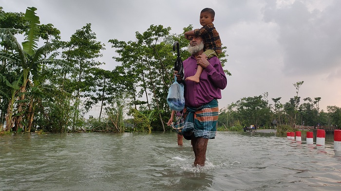 ঘরবাড়ি তলিয়ে যাওয়ায় নিজেদের পাশাপাশি গবাদিপশু নিয়েও বিপাকে পড়েছেন এসব এলাকার বাসিন্দারা।