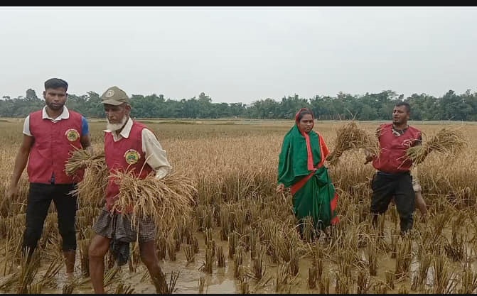 বন্যায় তলিয়ে যাওয়া ধান কাটা নিয়ে বড় দুশ্চিন্তায় ছিলেন জৈন্তাপুর উপজেলার উজানগর এলাকার দরিদ্র কৃষক সুলতান মিয়া। ধান কাটতে না পারায় চোখের সামনে ক্ষেতের পাকা সোনালী ধান নষ্ট হয়ে যাচ্ছিল। দিন ৫০০ টাকা দিয়েও শ্রমিক পাচ্ছিলেন না। দরিদ্র কৃষক সুলতান মিয়া মাঠের ধান কেটে দিলেন নিজপাট ইউনিয়ন আনসার-ভিডিপি সদস্যরা। তারা কয়েকটি প্লটের পাকা ধান কেটে মাথায় করে কৃষকের ঘরে তুলে দিয়েছেন।